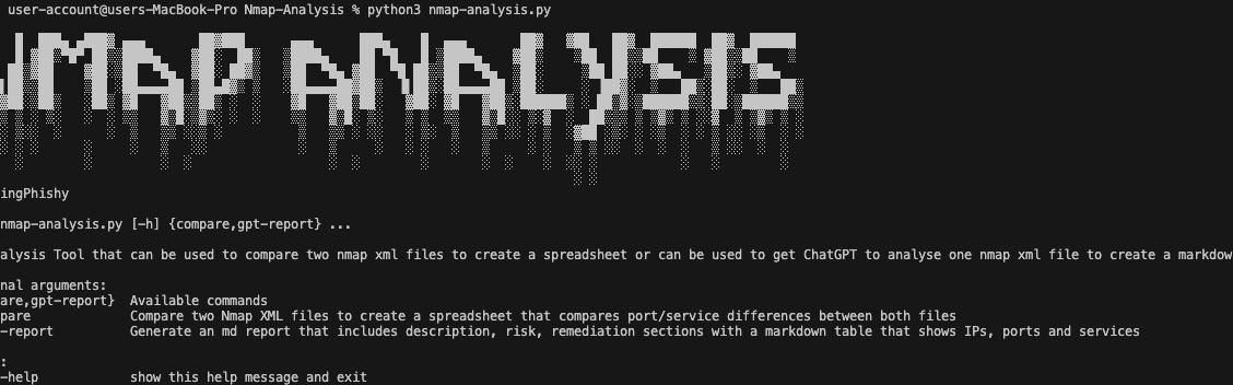 The script prints the help page if no args are passed, or you can access with python nmap-analysis.py -h
